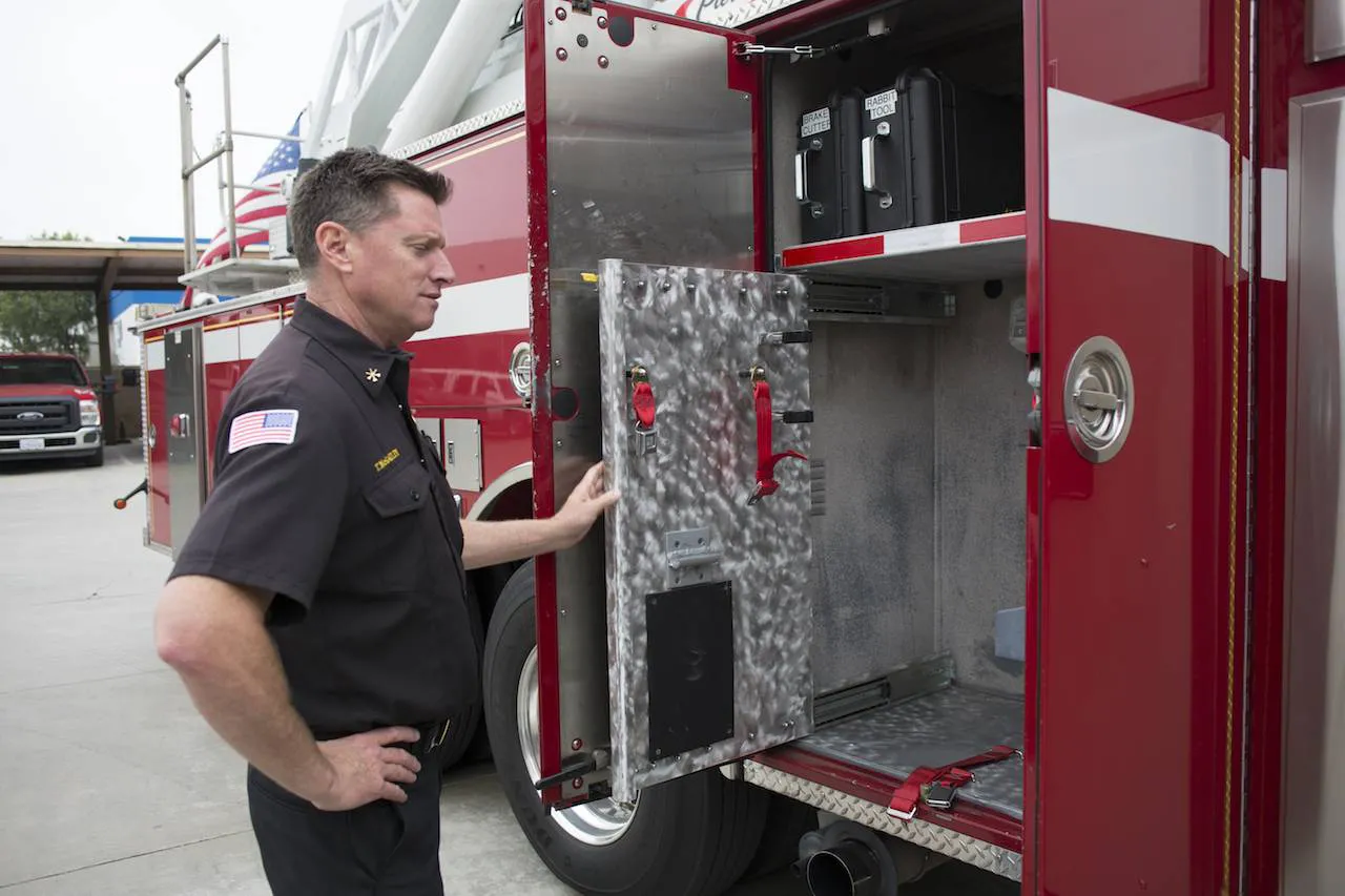 Chief Thomas Mcgauley, one of three division chiefs at the Santa Fe Springs Fire Department looks over the newly renovated compartment.