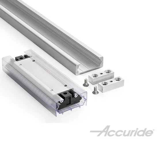 The Accuride 116RC is a heavy-duty carriage-and-track system. The system is made up of aluminum tracks, available in lengths of 2.4 meters (94.5 inches) and 3.6 meters (142 inches), and carriages with recirculating balls (in a choice of stainless steel or polymer). The 116RC can handle loads as much as 800 lbs. (see the 116RC technical sheet for more details).