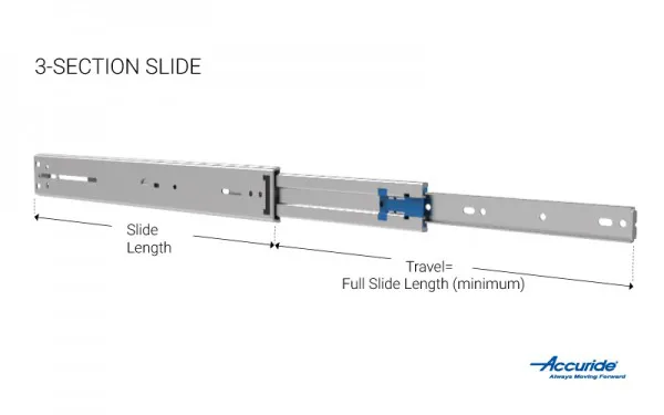 A chassis with a three-member slide extends 100% or more of the slide’s extended length. For example, A three-member slide at 20 in. long will extend 20 in.