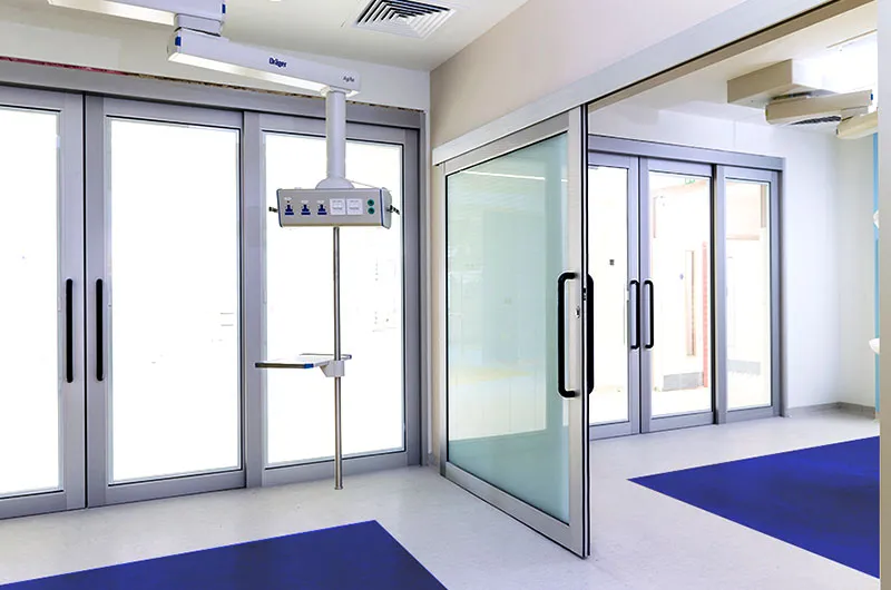 An image of an Accuride 116RC used on a large sliding door inside a hospital. The 116RC linear track system supports such heavy-duty applications thanks to a 793 lb. load rating